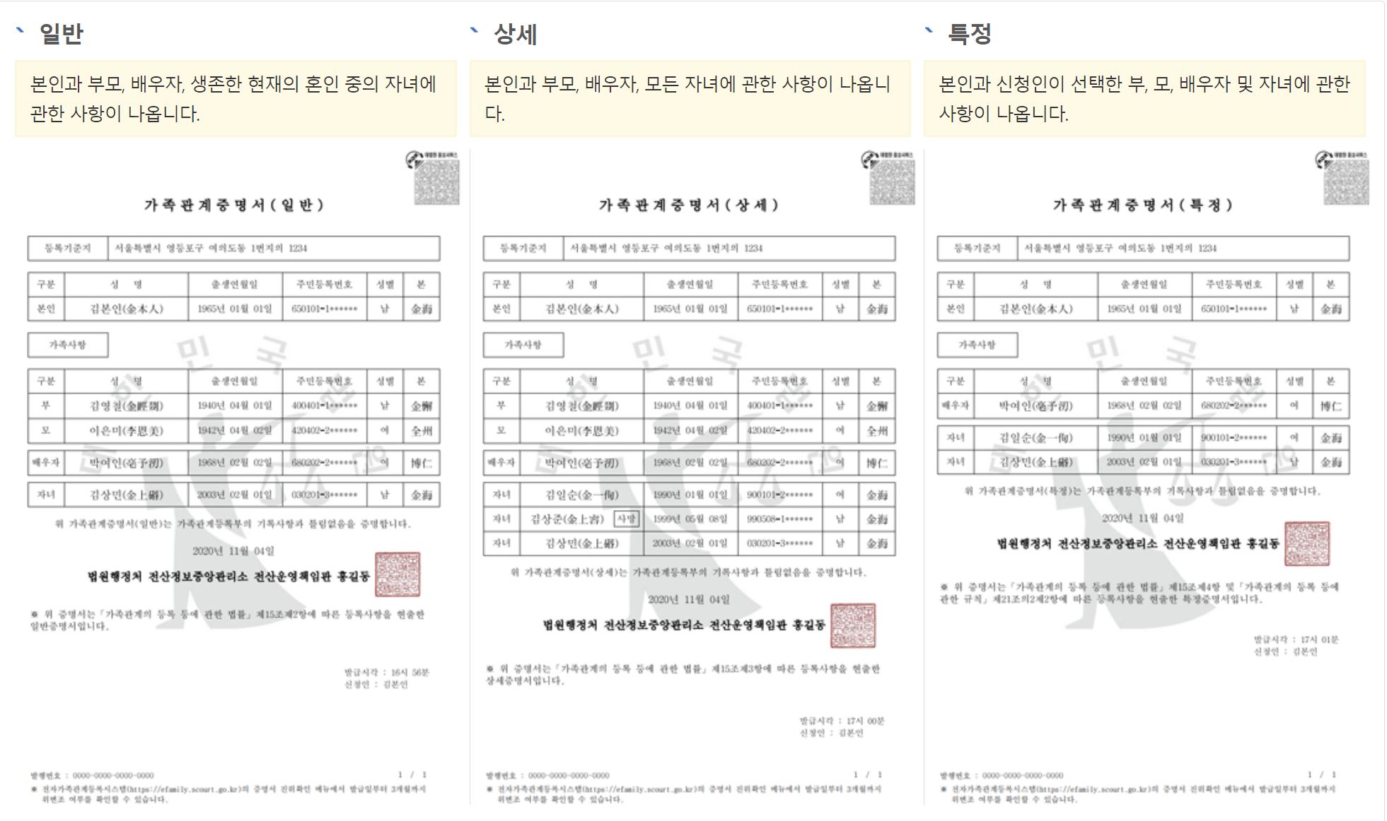 - 특정 - 본인과 신청인이 선택한 부, 모, 배우자 및 자녀에 관한 사항이 나옵니다.