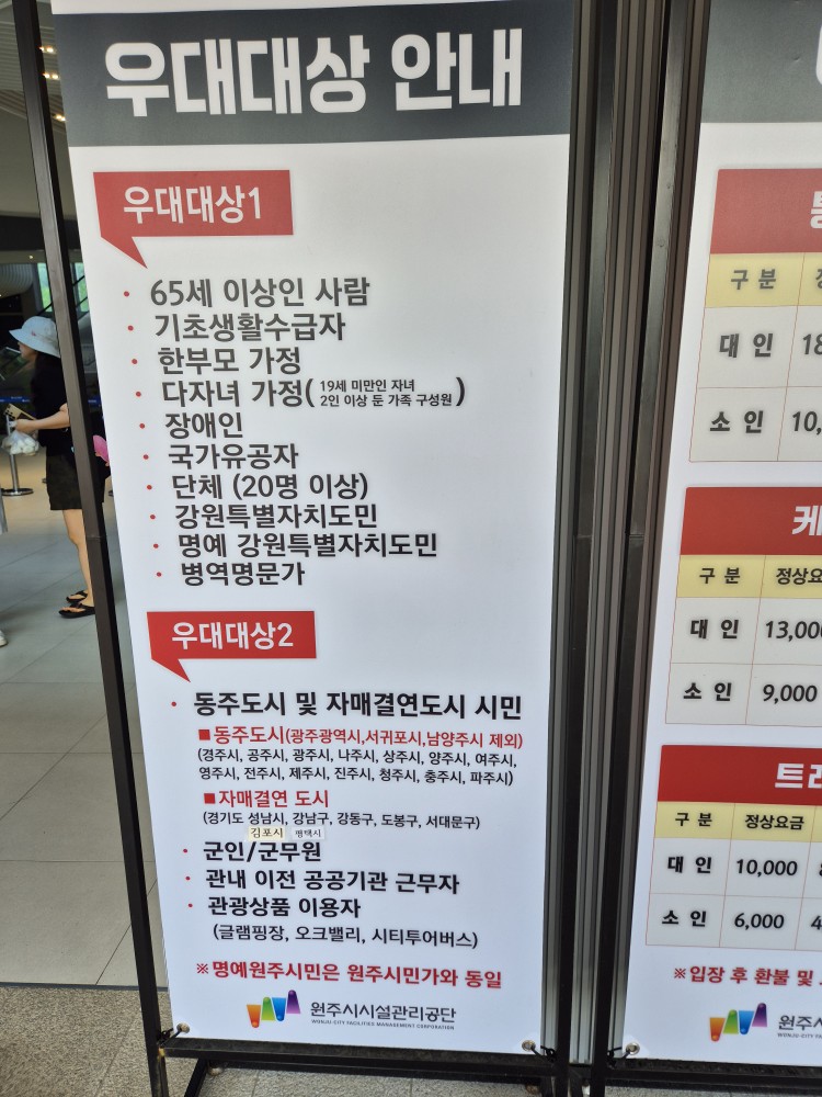 | 우대1 | 14,000 | 8,000 | 10,000 | 7,000 | 8,000 | 4,500 | - 65세 이상인 사람 - 기초생활수급자 - 한부모 가정 - 장애인 - 다자녀 가정(19세미만자녀 2인이상) - 국가유공자 - 단체 (20인 이상) - 강원특별자치도민 - 명예강원트결자치도민 - 병역명문가(본인만) |