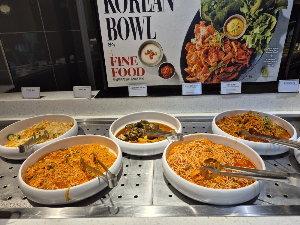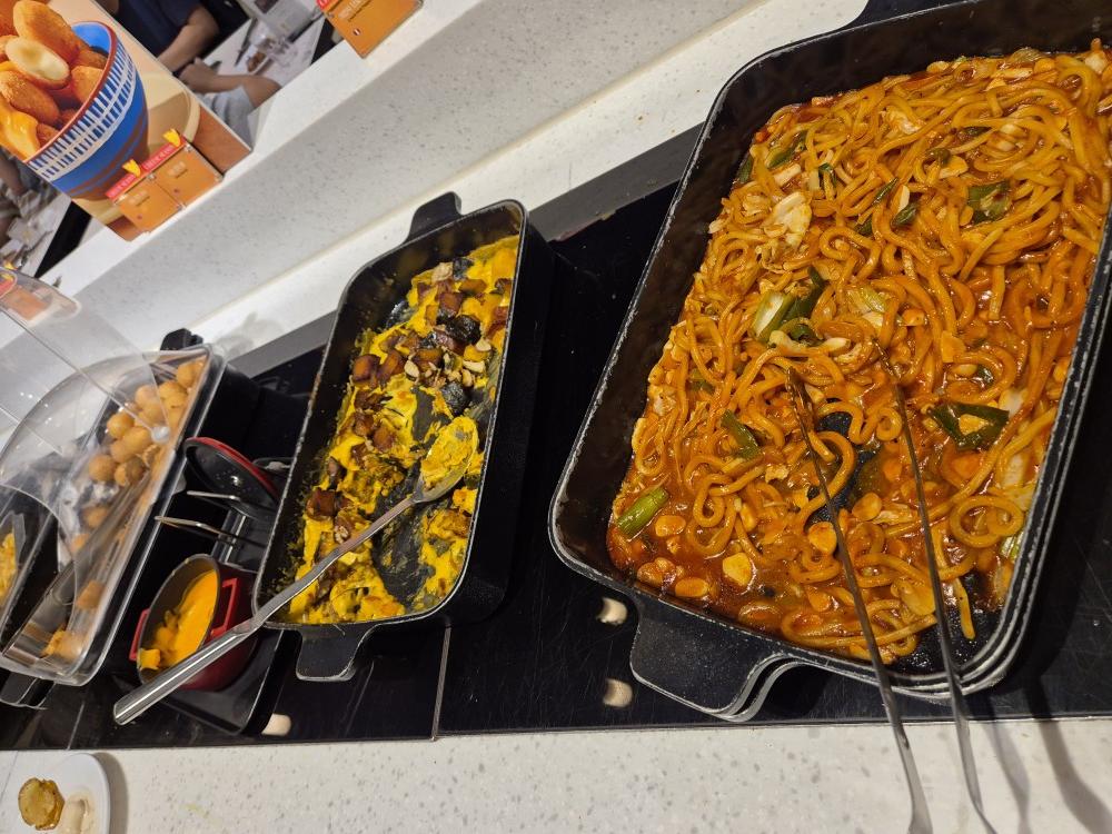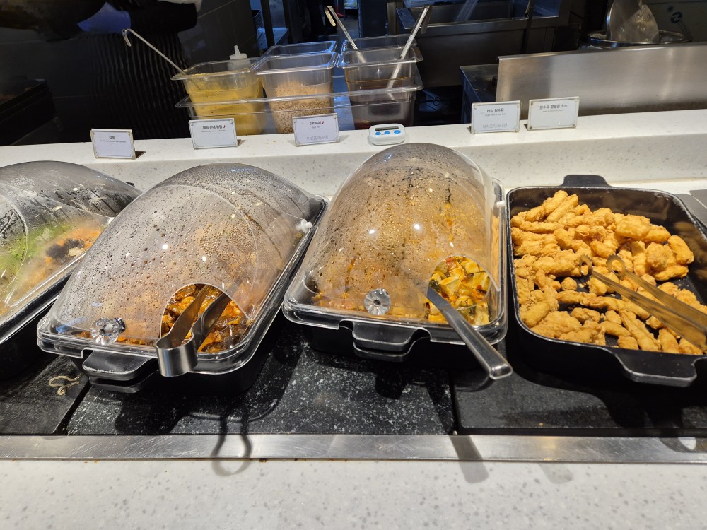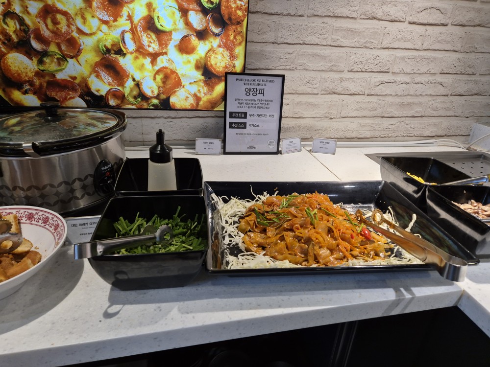 파스타는 사진에 3종류만 찍혔는데 총 4가지 종류로 크림, 두움바, 토마토, 알리오올리오가 준비되어 있었습니다. 양장피와 함께 옆에 있는 매뉴는 전복죽과 미역국입니다. 그 옆으로는 한식 메뉴들이 있었는데 지금 보니 사진만 찍고 먹어보지는 못했습니다.