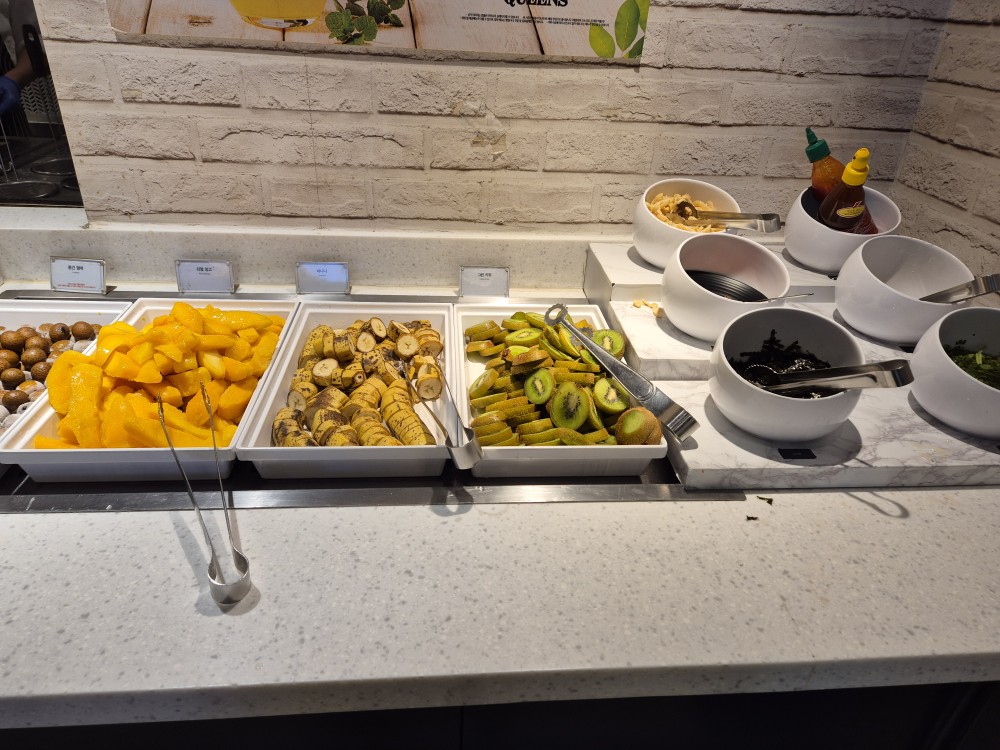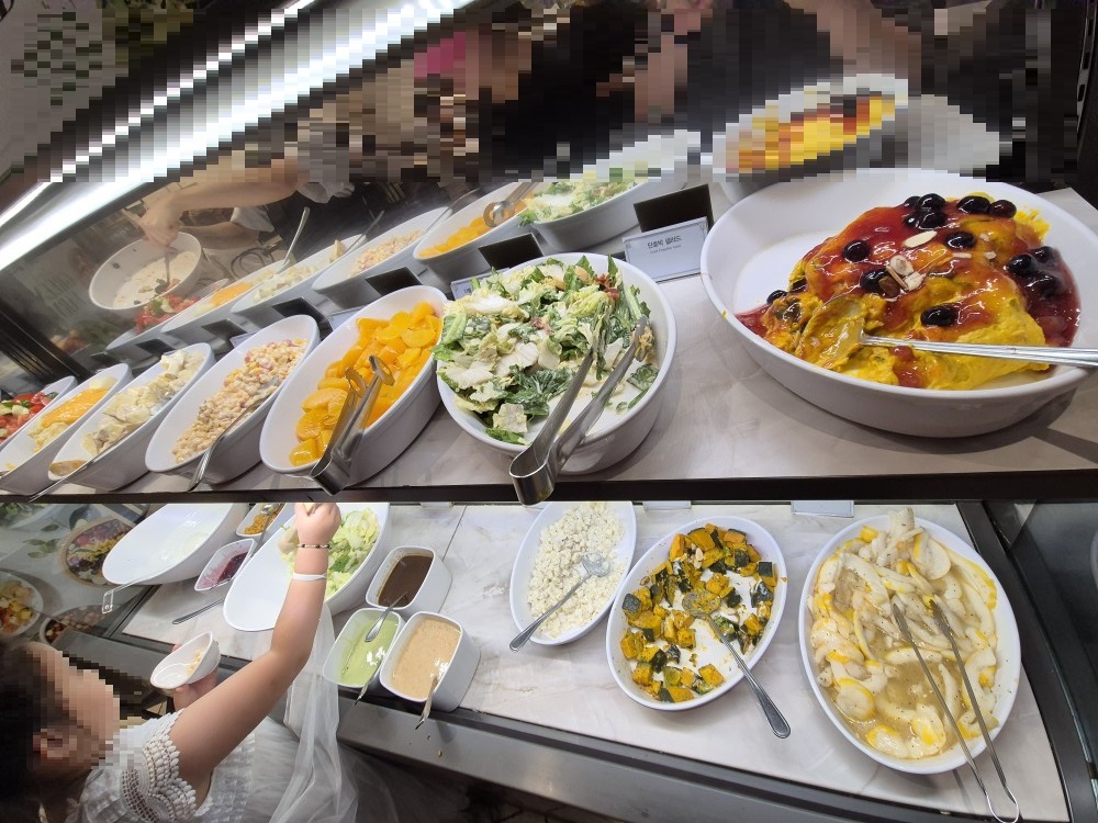 처음 가서 눈에 가장 먼저 띈 샐러드, 과일 후식들입니다. 후식들은 사람들이 많이 찾았는지 벌써부터 많이 비어있는 모습이었습니다. 아침도 거른 터라 너무 배가 고파 대충 사진을 찍으며 음식을 담기 바빴습니다.
