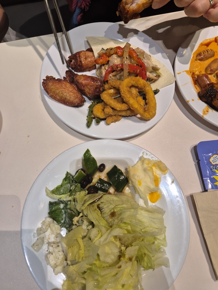 한 바퀴를 빙 둘러보고 처음 선택한 음식들입니다. 너무 배가 고파서 대충 사진을 남기고 먹는데 바빴습니다. 홍합탕은 너무 싱거웠고 파스타는 보통의 뷔페 파스터였습니다. 연어 초밥과 타코 고추냉이 군함등 해물 쪽은 생각보다 별로였습니다. 그래도 멍게 비빔밥은 입맛 돋우기에 좋았으며 버펄로윙, 생선요리, 메밀 소바, 떡볶이 등 맛있는 음식도 많았습니다.