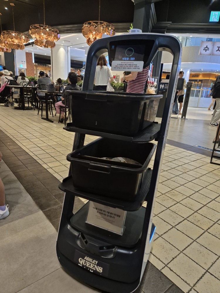 배부르게 1시간 반을 먹고 다 먹은 그릇들은 로봇을 불러 정리하였습니다. 직원들도 같이 치우기는 했지만 로봇들이 열일을 하고 있는 모습이 신기했습니다. 딸아이는 후식으로 초코를 한가득 가져와서 퐁듀로 먹었고 저는 아내가 가져온 크로아상 생지 와플과 함께 커피 먹으며 마무리했습니다. 크루아상 생지 4개를 함께 구워서 꽃모양을 만들었습니다. 배가 불러서 더는 못 먹을 것 같았는데 달달한 와플이 후식으로 좋았습니다. 아이스크림은 망고 패션후르츠, 바닐라 이렇게 2가지 종류가 있었습니다. 개인적으로는 망고 패션후르츠 맛이 상큼하니 더부룩한 속을 달래주었습니다.