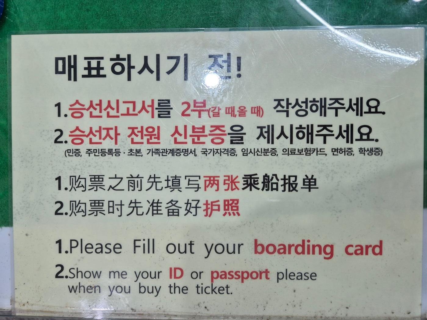 승선신고서를 2부 작성하셔야 하고 승선자 전원 신분증을 제시해야 합니다. (민증, 주민등록등, 초본, 가족관계증명서, 국가자격증, 임시신분증, 의료보험카드, 면허증, 학생증)