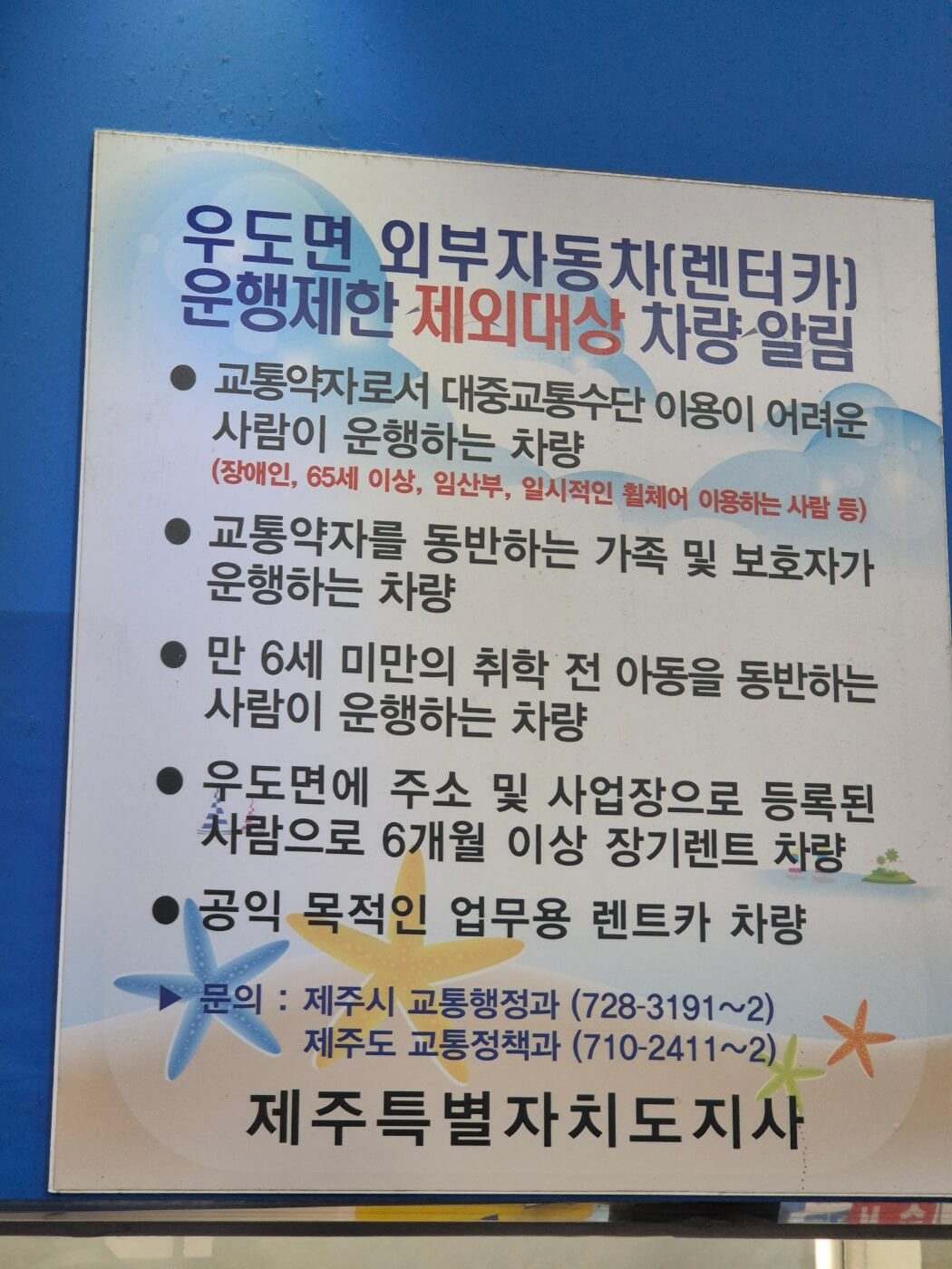 - 우도면에 주소, 사업장으로 등록된 자로 6개월 이상 장기렌트하는 차량(우도면에서 스티커 발부)