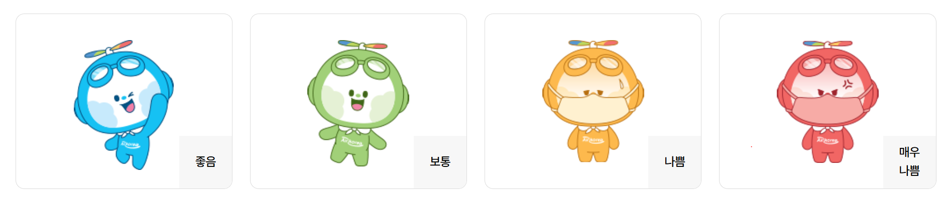 대기의 환경을 위의 캐릭터로 표현하여 대기 상황을 한 눈에 쉽게 알아볼 수 있도록 했습니다.